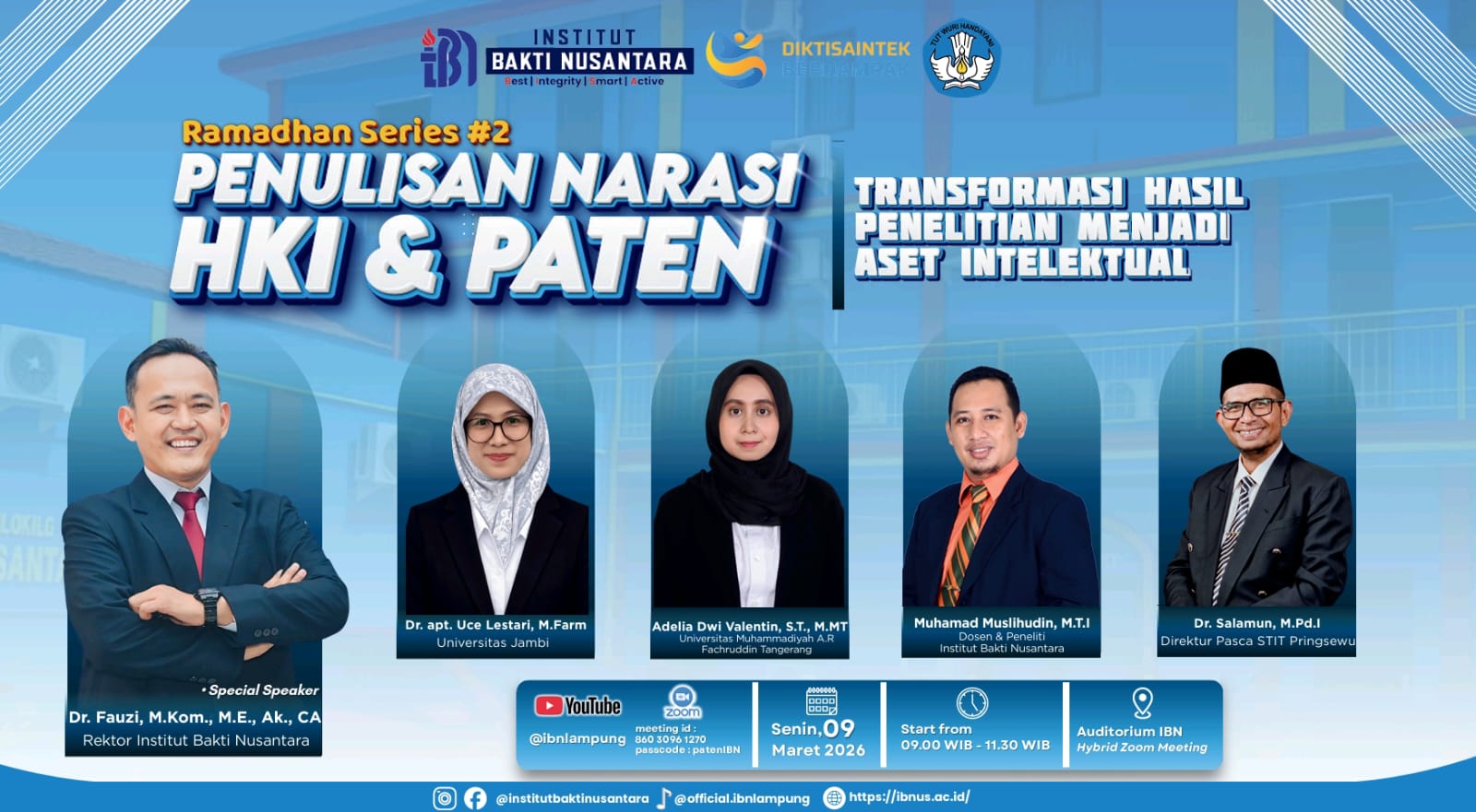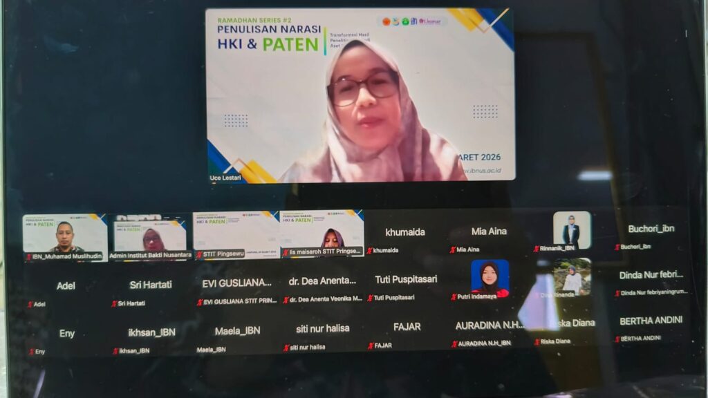 Pringsewu, 9 Maret 2026 — Upaya mendorong hilirisasi hasil penelitian menjadi kekayaan intelektual (HKI) yang bernilai strategis terus diperkuat oleh Institut Bakti Nusantara melalui pelatihan bertajuk “Transformasi Hasil Penelitian menjadi Aset Intelektual: Pelatihan Penyusunan Narasi Paten dan HKI.” Kegiatan ini menghadirkan akademisi dan praktisi dari berbagai perguruan tinggi untuk berbagi wawasan terkait penyusunan deskripsi paten dan pengelolaan HKI secara profesional.